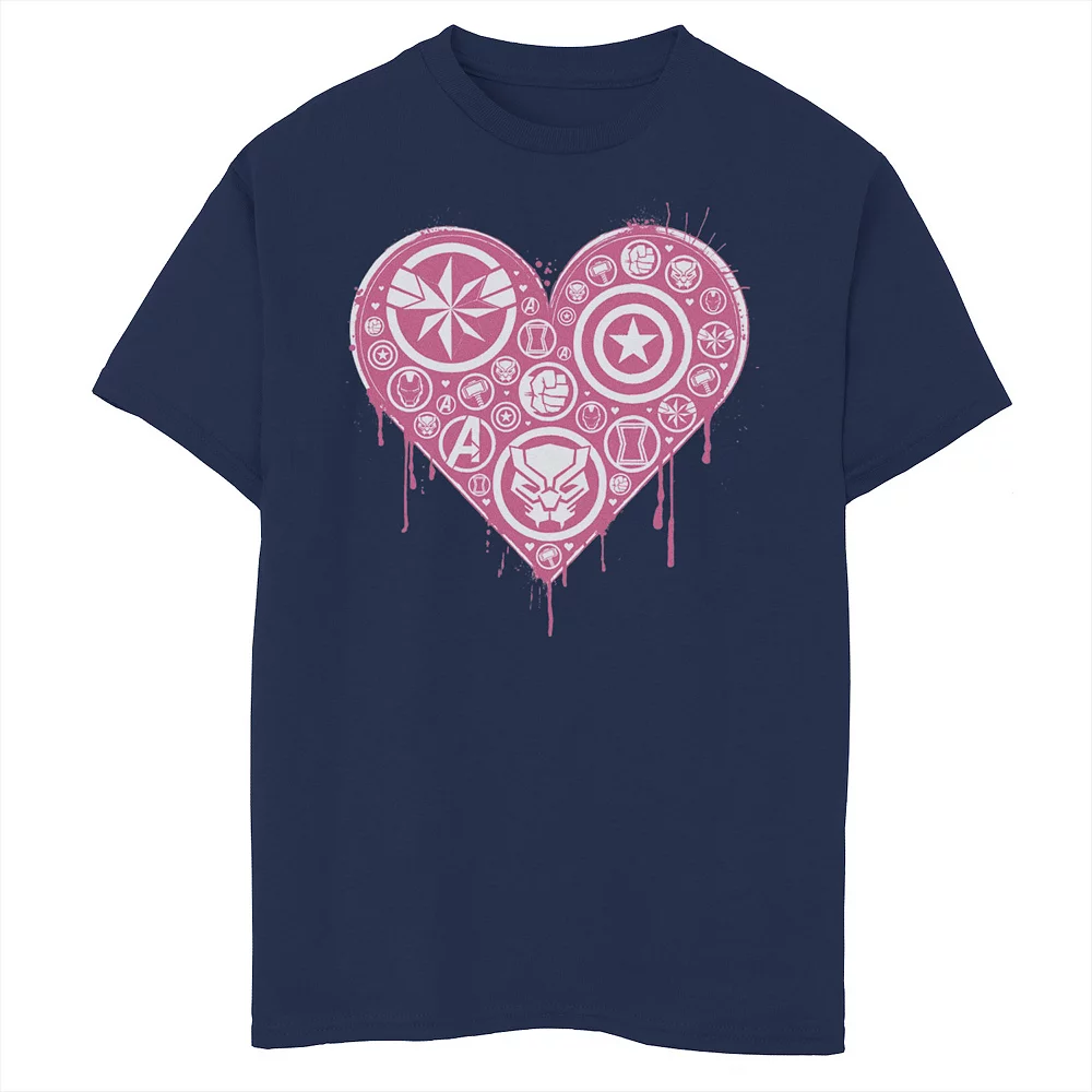 He’ll love showing off his favorite characters with this boys’ Marvel Group Shot Logo Filled Heart Graphic Tee.