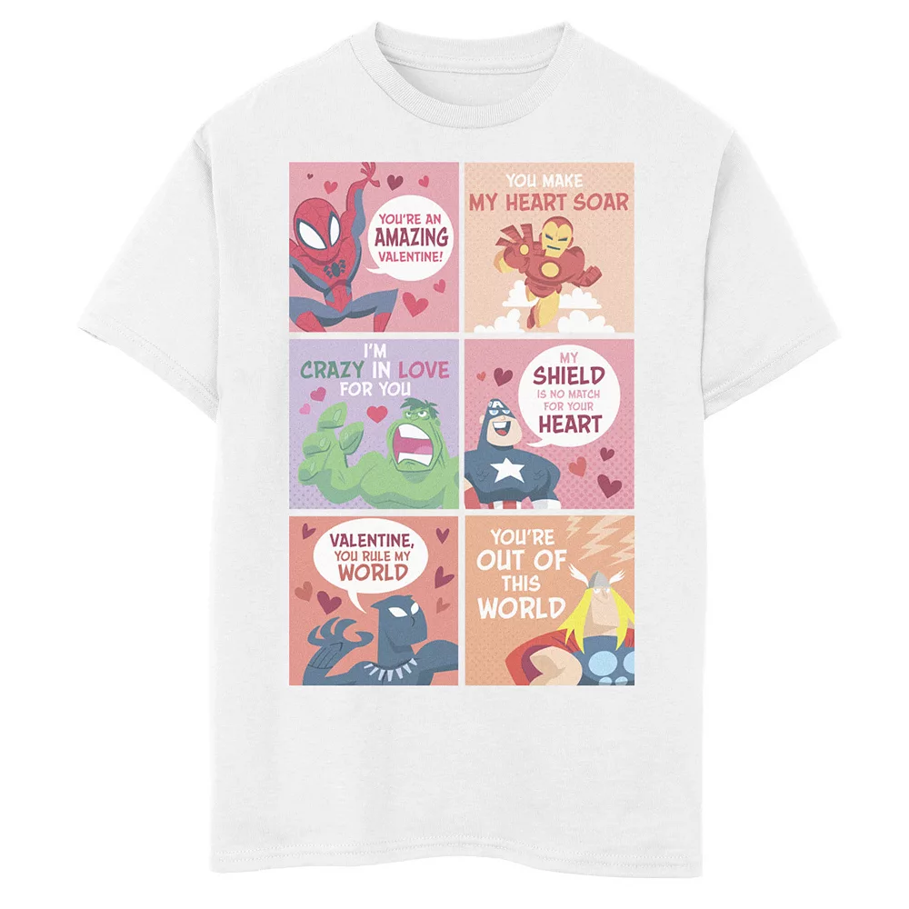 He’ll love showing off his favorite characters with this boys’ Marvel Group Shot Valentines Day Cards Graphic Tee.