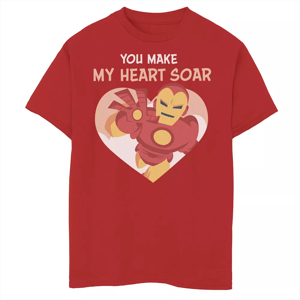 He’ll love showing off his favorite characters with this boys’ Marvel Iron Man You Make My Heart Soar Valentine Card Graphic Tee.