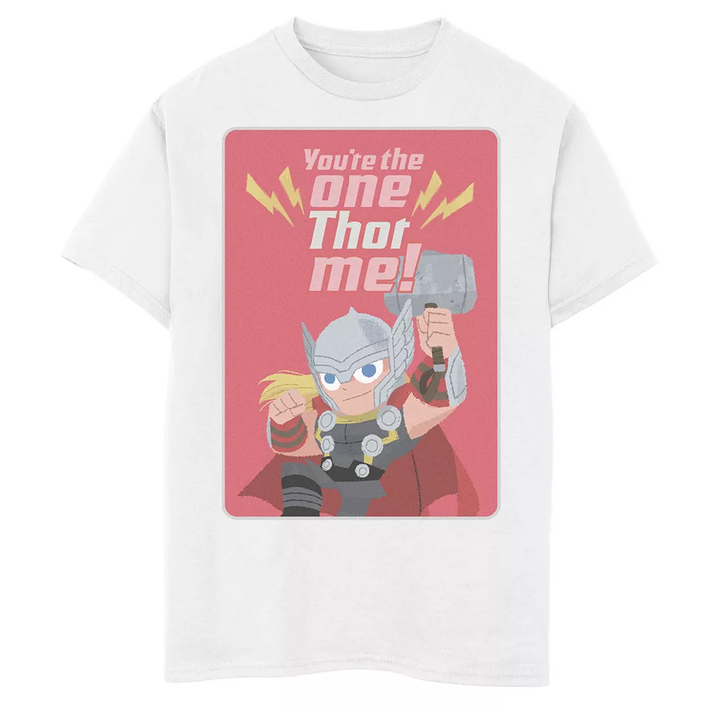 He’ll love showing off his favorite characters with this boys’ Marvel Thor You’re The One Thor Me Valentine Card Graphic Tee.