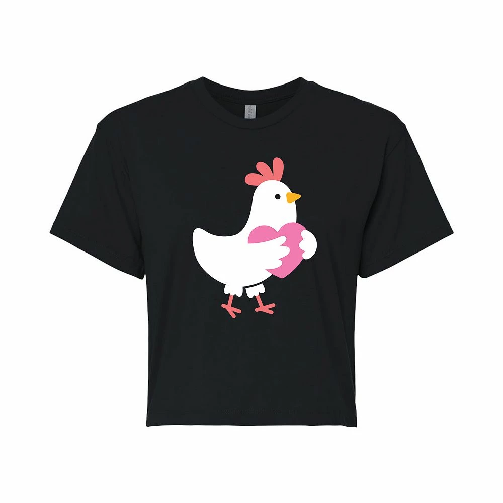 Look cute in this juniors’ chicken and heart cropped graphic tee.