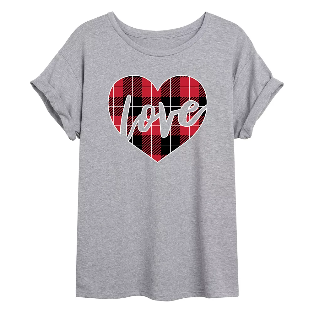 You’ll love the cozy cabin vibe of this juniors’ “Love” plaid heart oversized graphic tee.