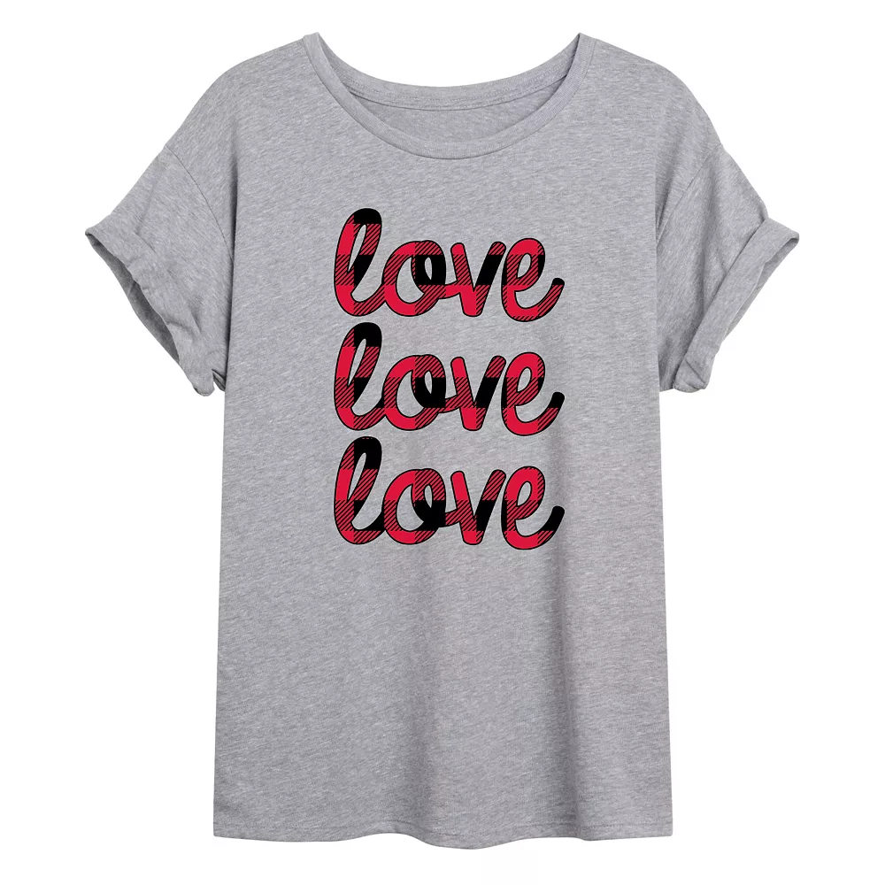 You’ll love the cozy cabin vibe of this juniors’ “Love” plaid heart oversized graphic tee.