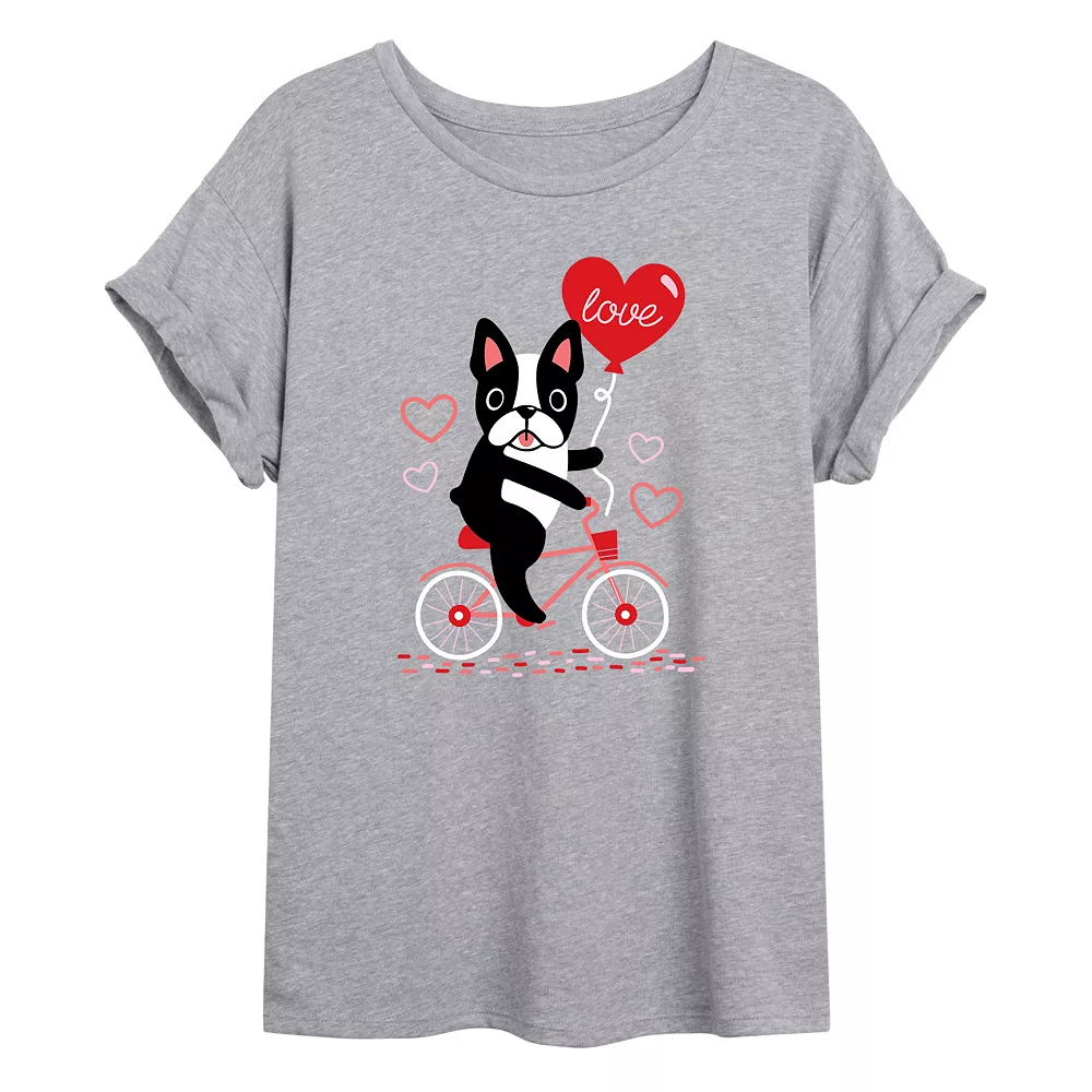 This pup is enjoying a beautiful bike ride on this juniors’ Valentine’s Day oversized graphic tee.