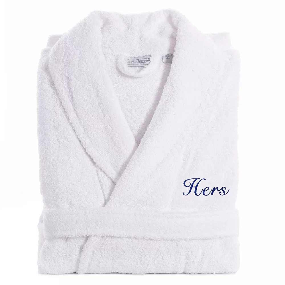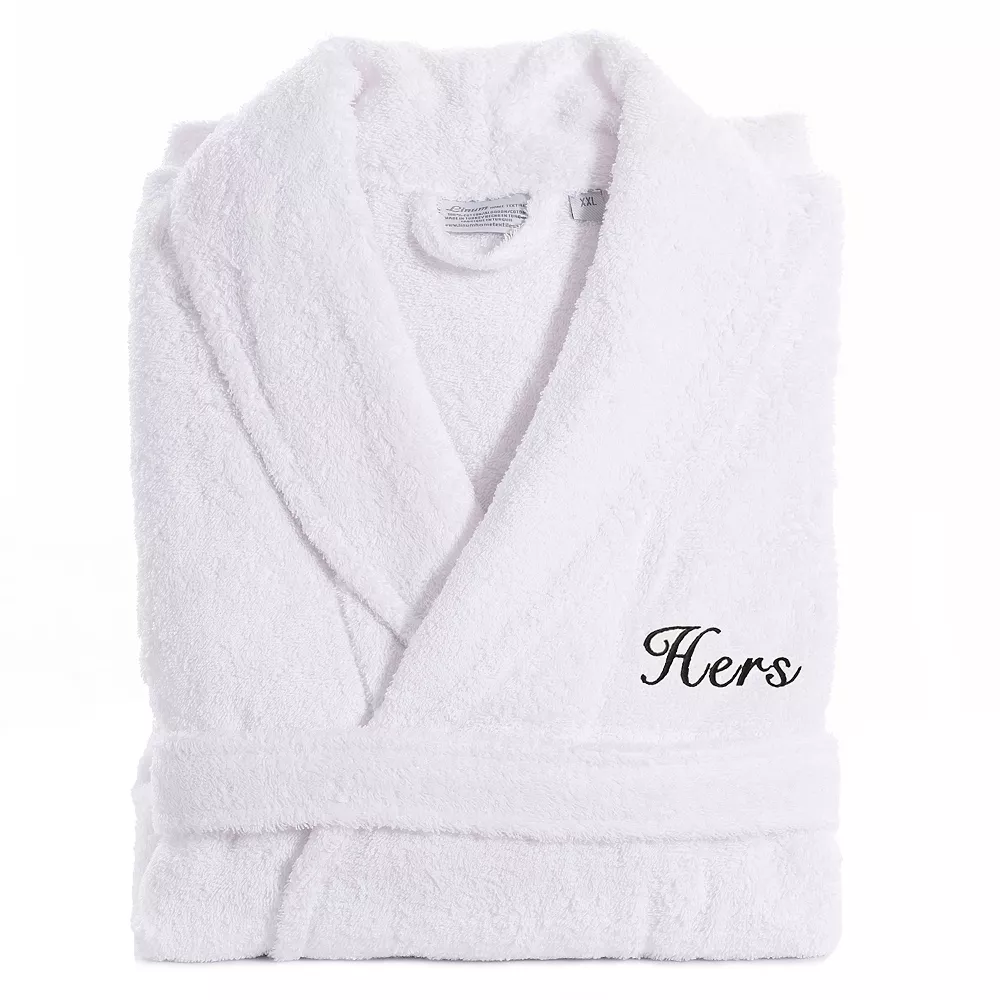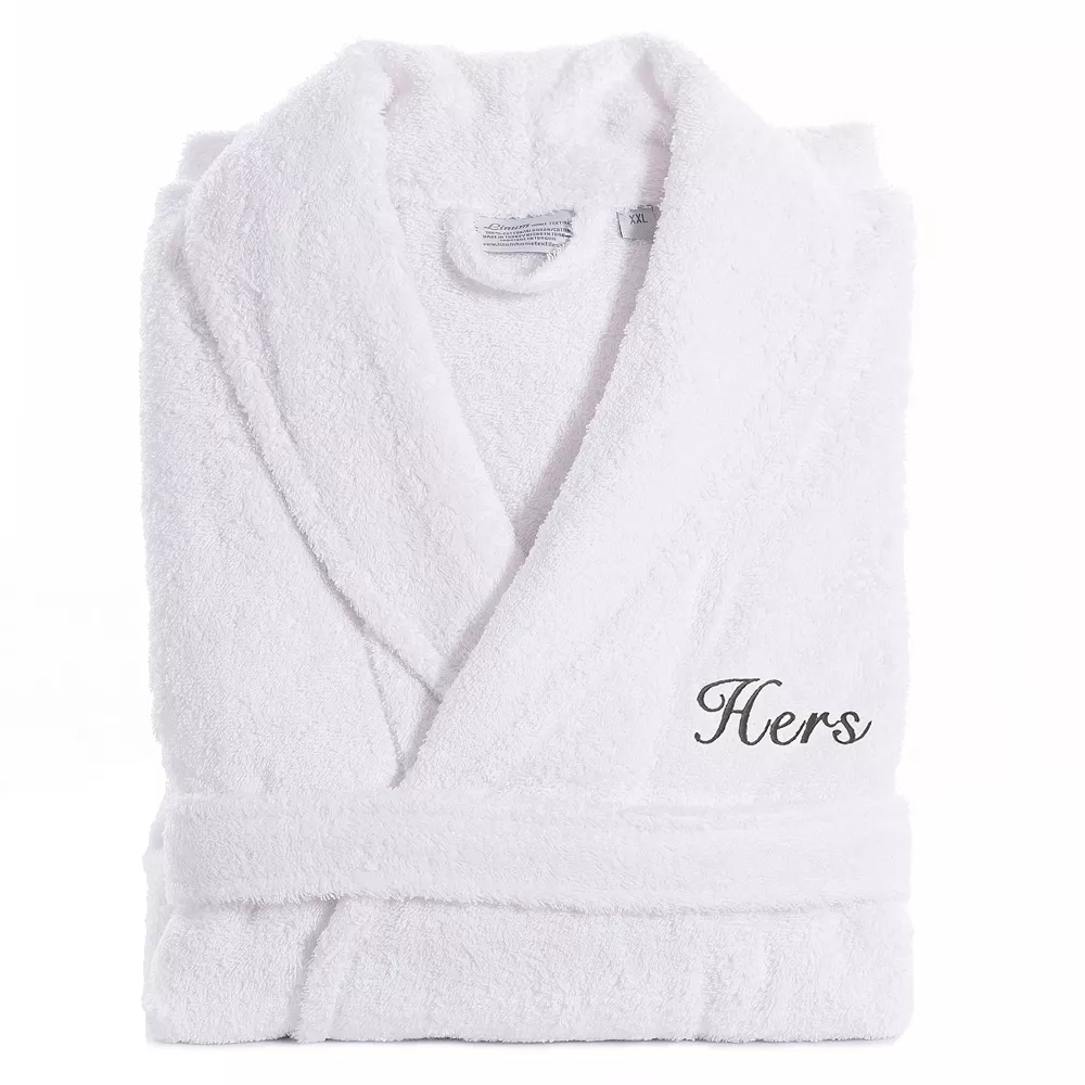 Dry off with style, elegance, and comfort with this luxurious, soft, and absorbent women’s “Hers” terry bathrobe from Linum Home Textiles.